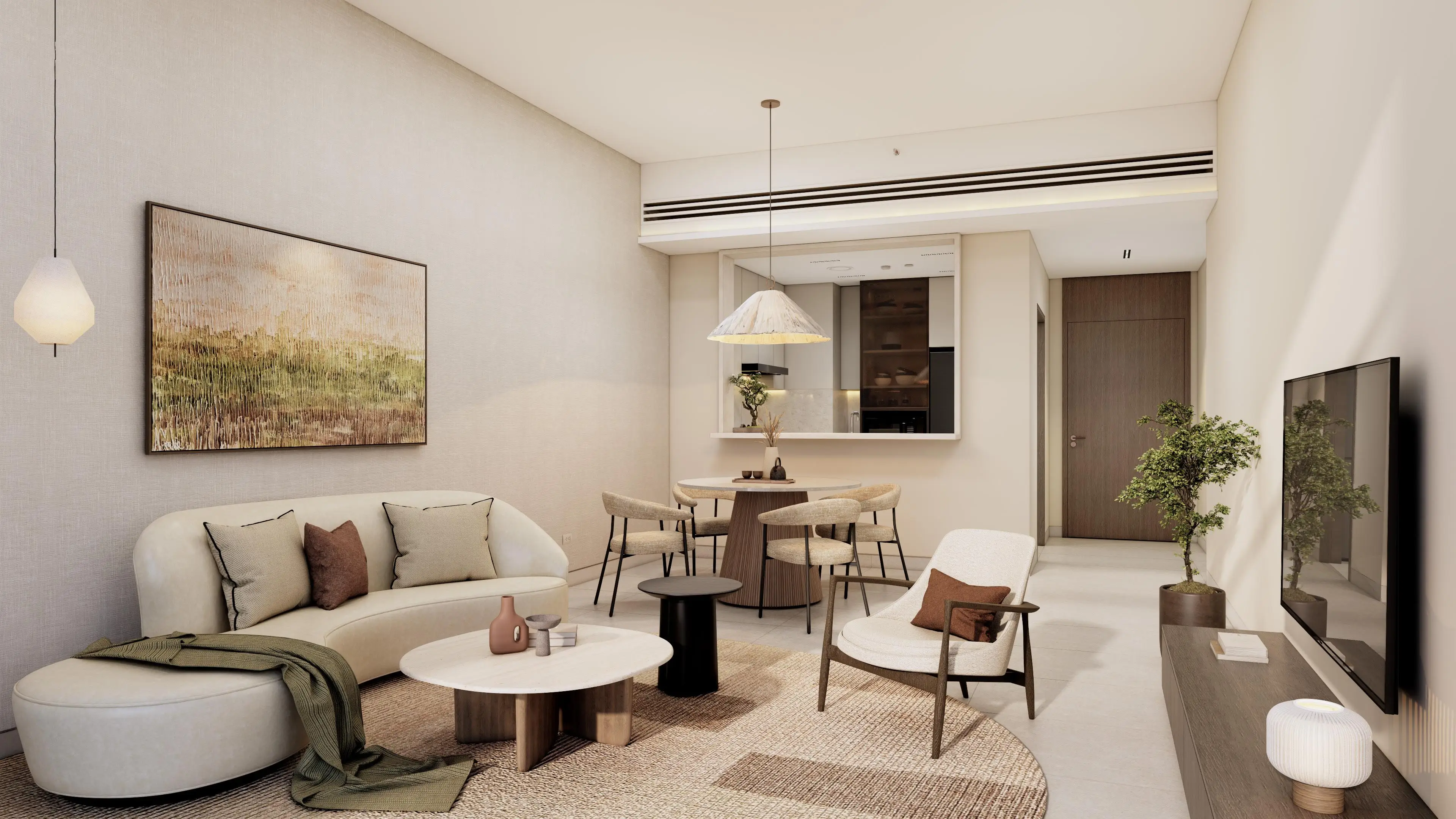 The residences include studios, one-, two-, and three-bedroom apartments, units with maid’s rooms, as well as duplex penthouses and townhouses. Interiors are contemporary in style, featuring large windows that maximize natural light, high-quality materials, and built-in storage solutions. Townhouses and penthouses benefit from private elevators, while the exterior design offers open views with textured façades and landscaped terraces.