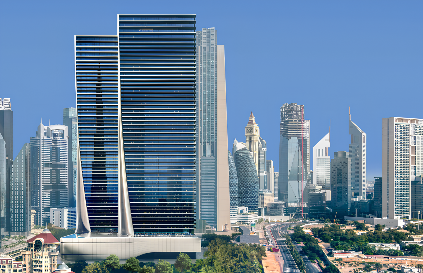 Akala Hotel & Residences by Arada Properties presents a contemporary architectural statement in the Za’abeel 2 district of Dubai. Comprising two elegant towers, the development features facades that blend natural stone with polished metal, reflecting a thoughtful integration of natural elements and modern technology. The towers share four basement levels dedicated to parking, with luxury amenities distributed across the ground floor and three podium levels.