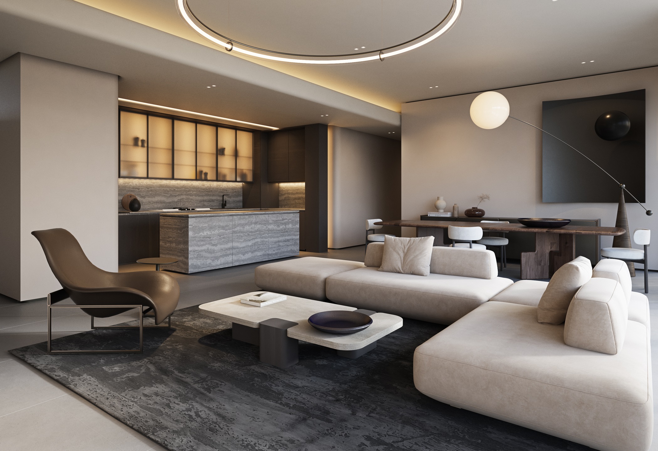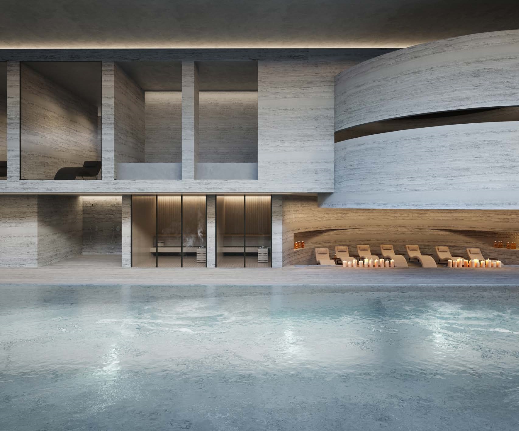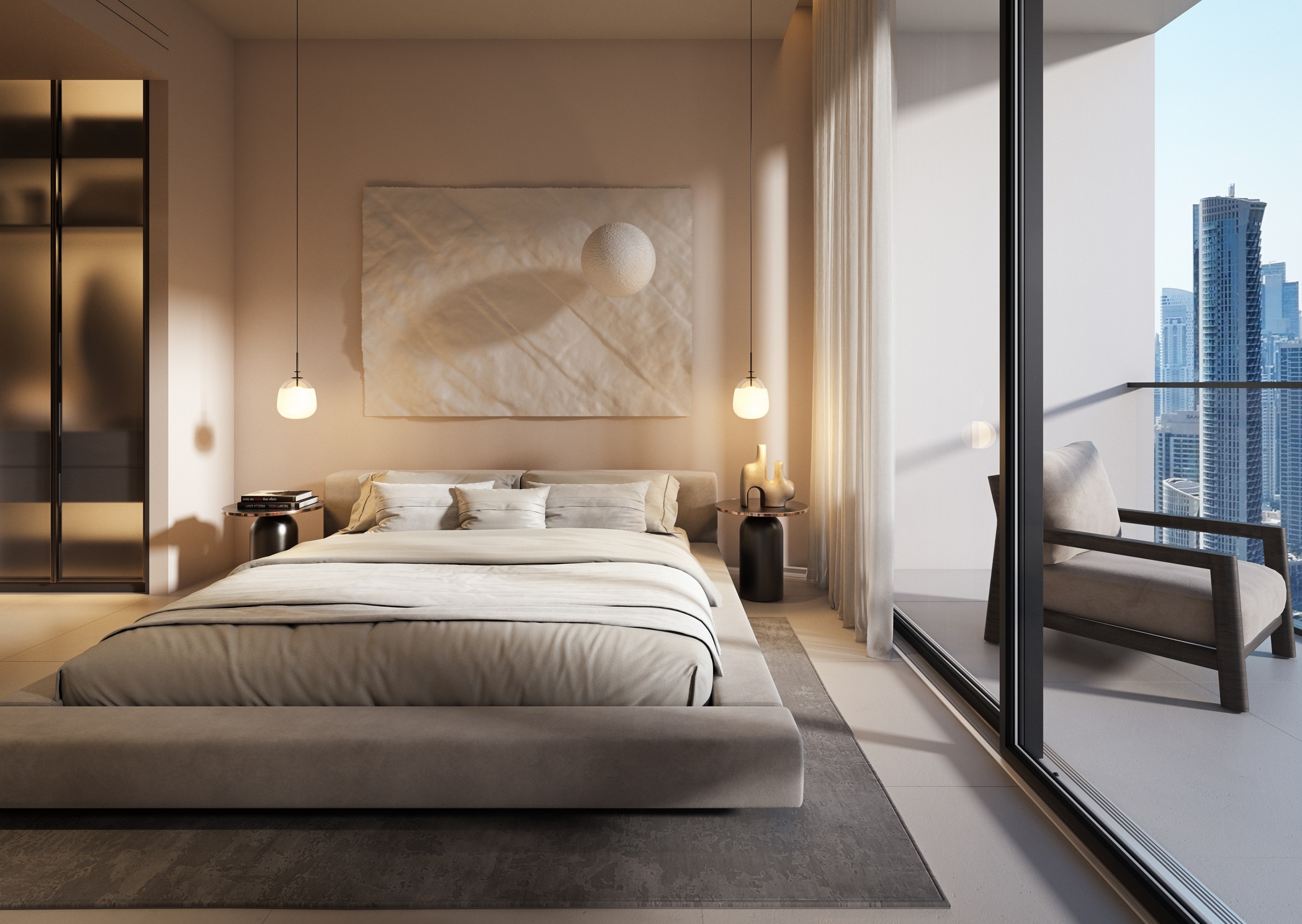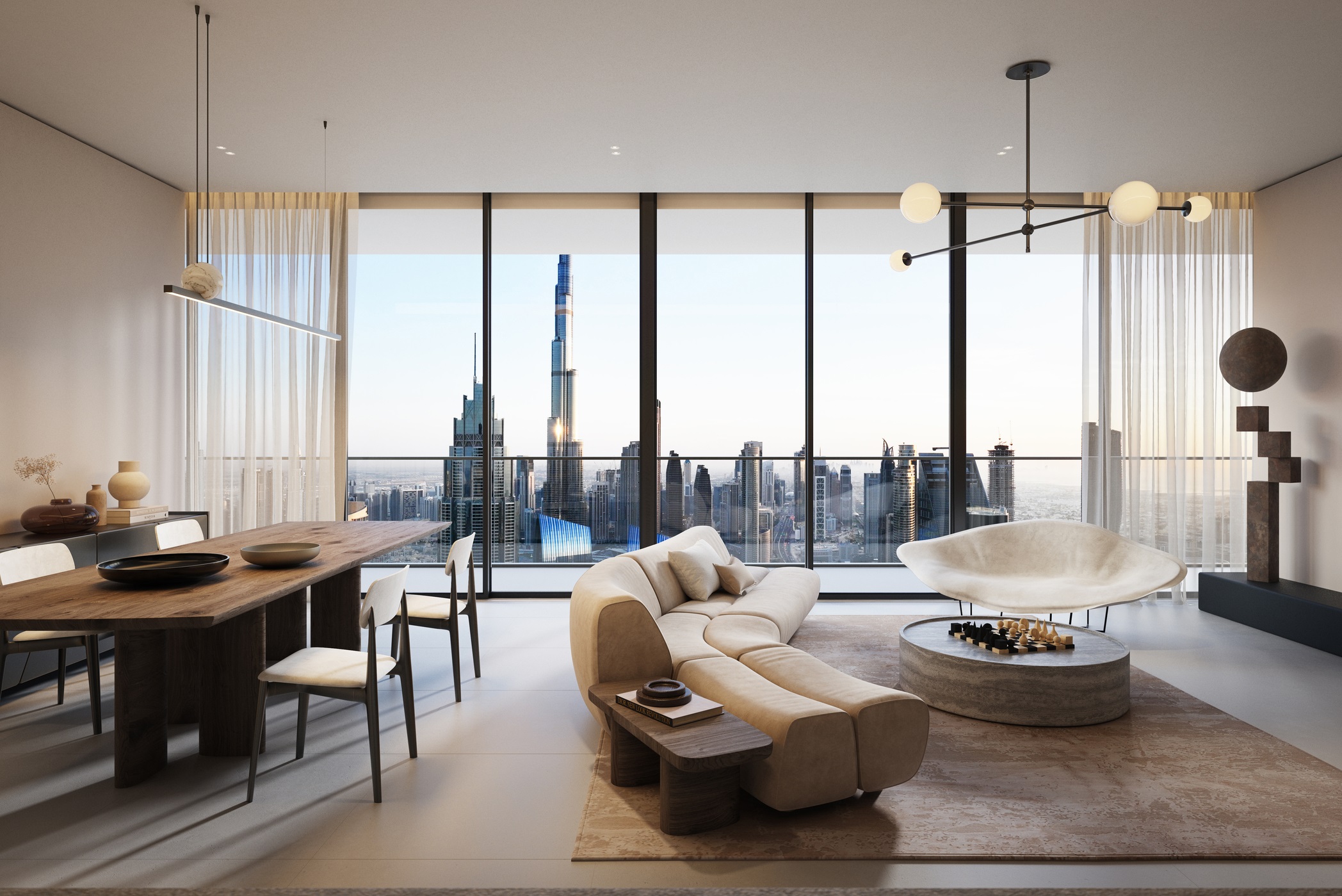 The residential component is housed in Tower 1, spanning floors 4 through 51, offering apartments with one to six bedrooms, including penthouses with terraces. Interiors emphasize spacious layouts, panoramic glazing, and wellness-oriented design. Each apartment includes a kitchen with an island, spa-style bathrooms, and generous walk-in closets. Tower 2 accommodates luxury hotel suites from the 4th to 51st floors, providing premium hospitality services.