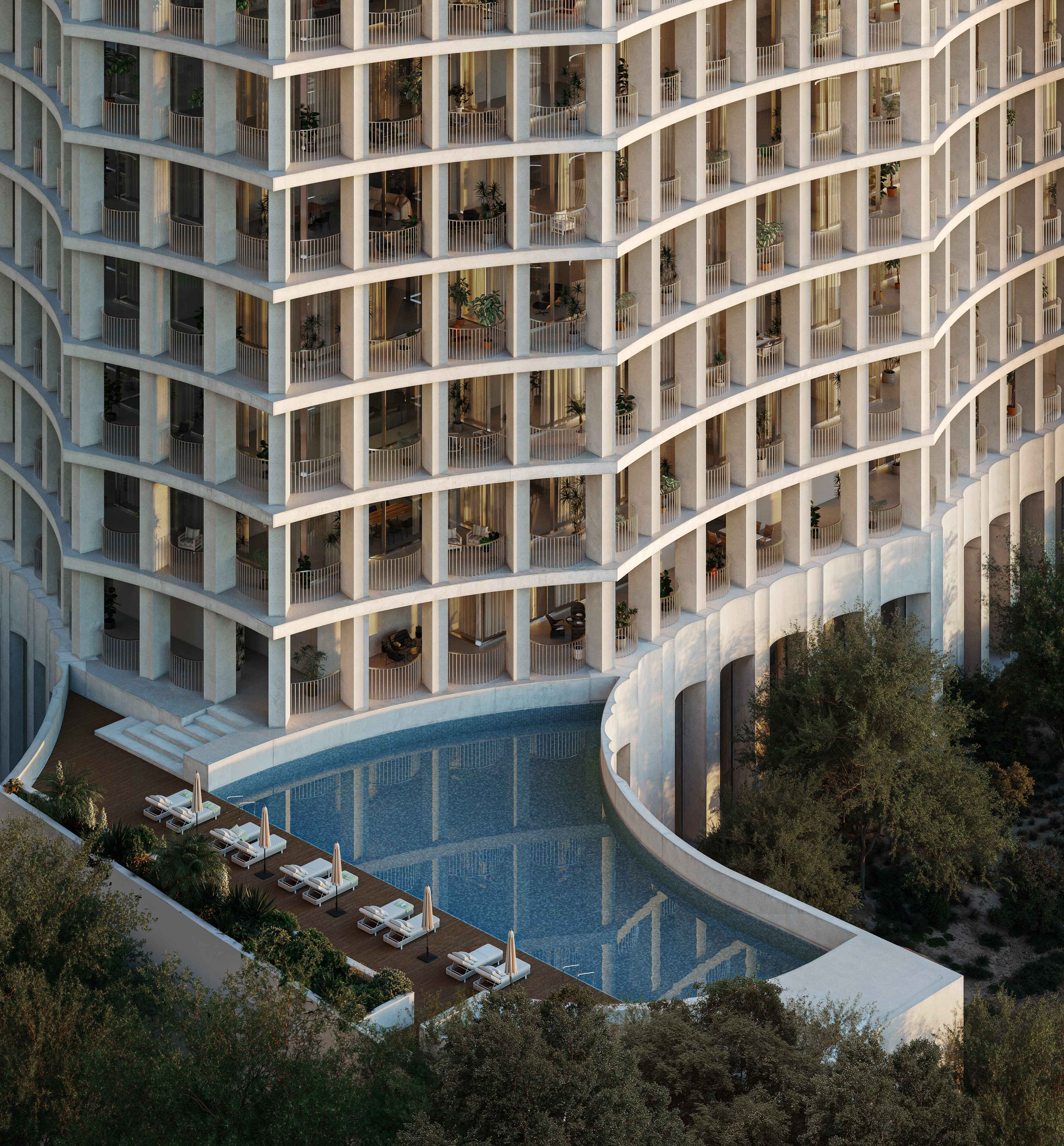 Eden House Za'abeel is a luxury residential development by H&H Development, situated in the Za'abeel neighborhood on the edge of the dynamic Dubai International Financial Center (DIFC). The building features a sculptural concrete design integrated with landscaping elements, creating a harmonious and tranquil environment. Developed by DXB Lab with interiors by Tristan Auer, the architecture emphasizes a seamless connection with its surroundings across 45 residential floors above ground level.