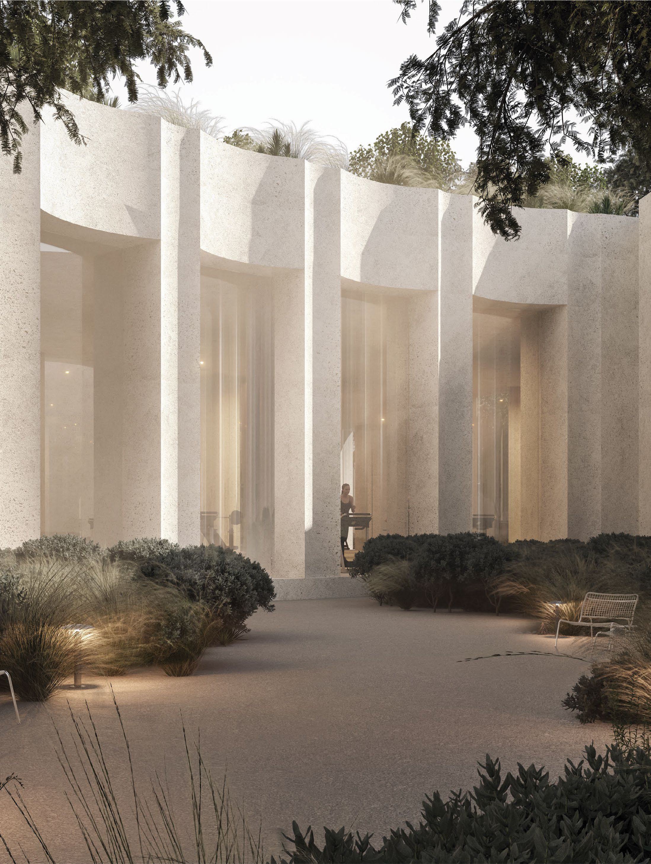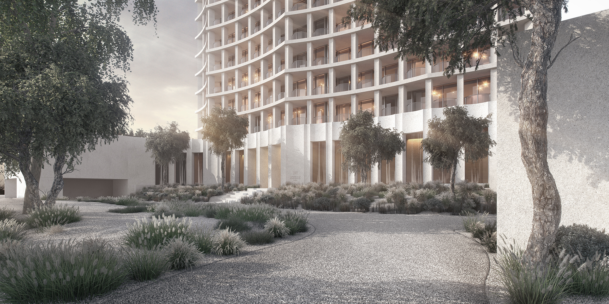 The residences comprise one, two, and three-bedroom apartments finished with premium materials including natural stone, marble, and wood. A monochrome palette enhances the interplay of light and shadow, while stone mosaics add refined detail to the interiors. The design approach prioritizes quality and subtle elegance throughout the living spaces.