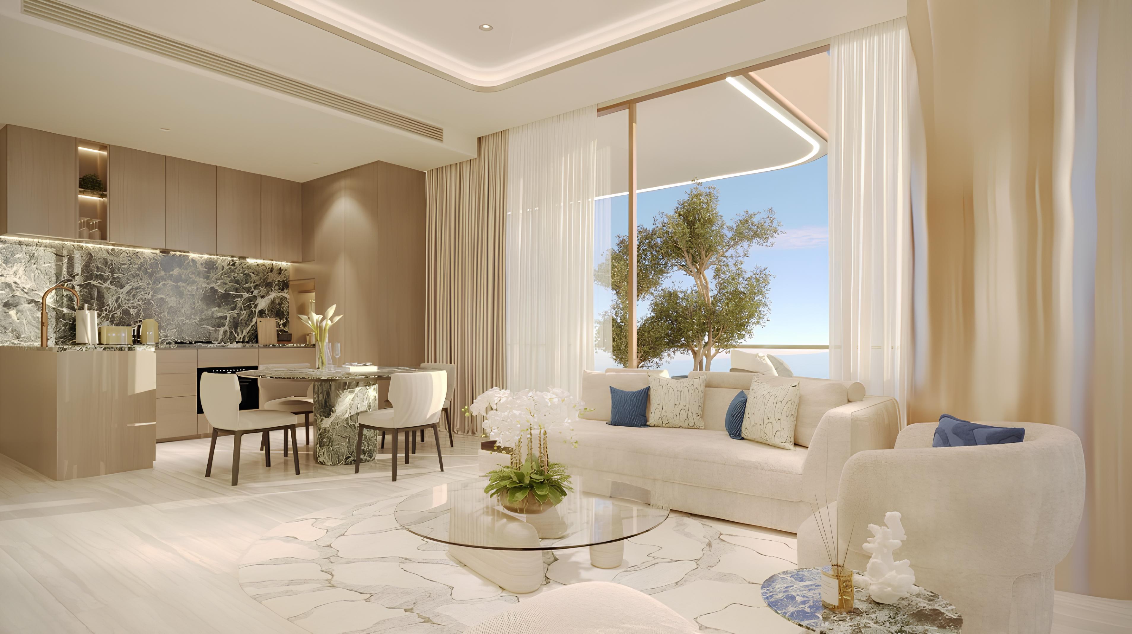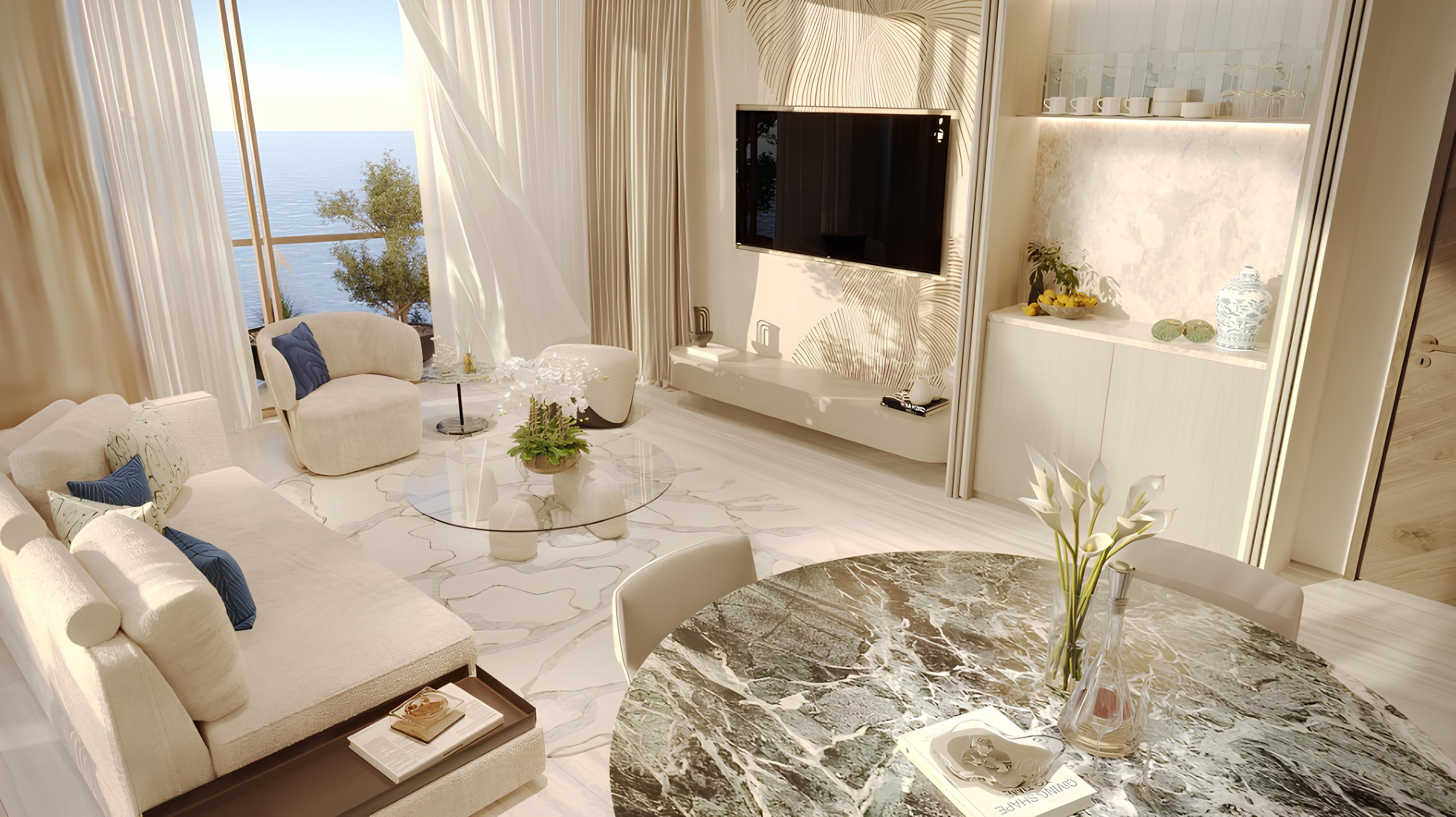 The residences include two and three-bedroom apartments featuring interiors crafted by a British designer with Italian-inspired furniture. Many units offer expansive views of the sea and adjacent golf course, combining aesthetic appeal with functional living spaces. The development is scheduled for handover in March 2028.