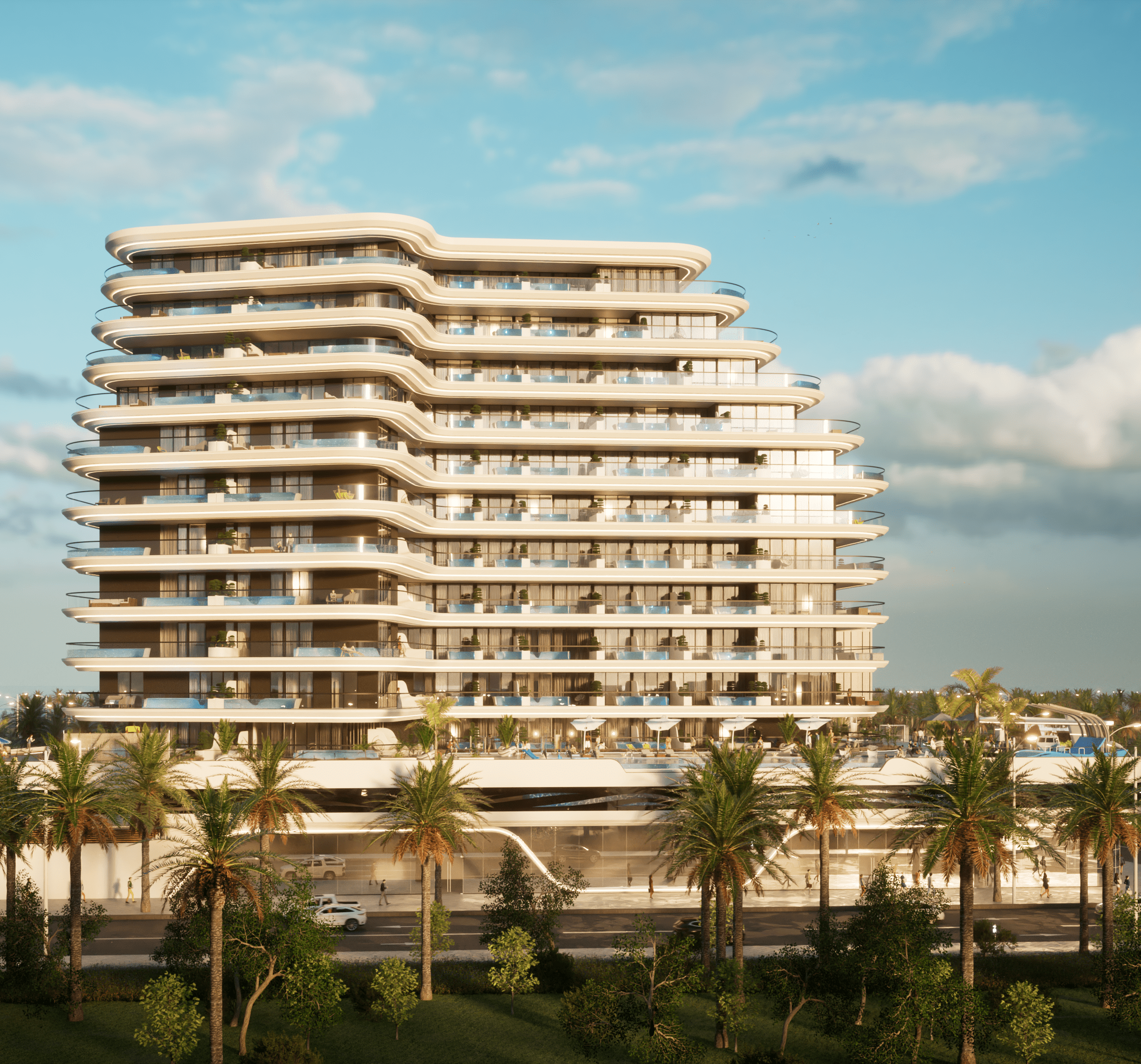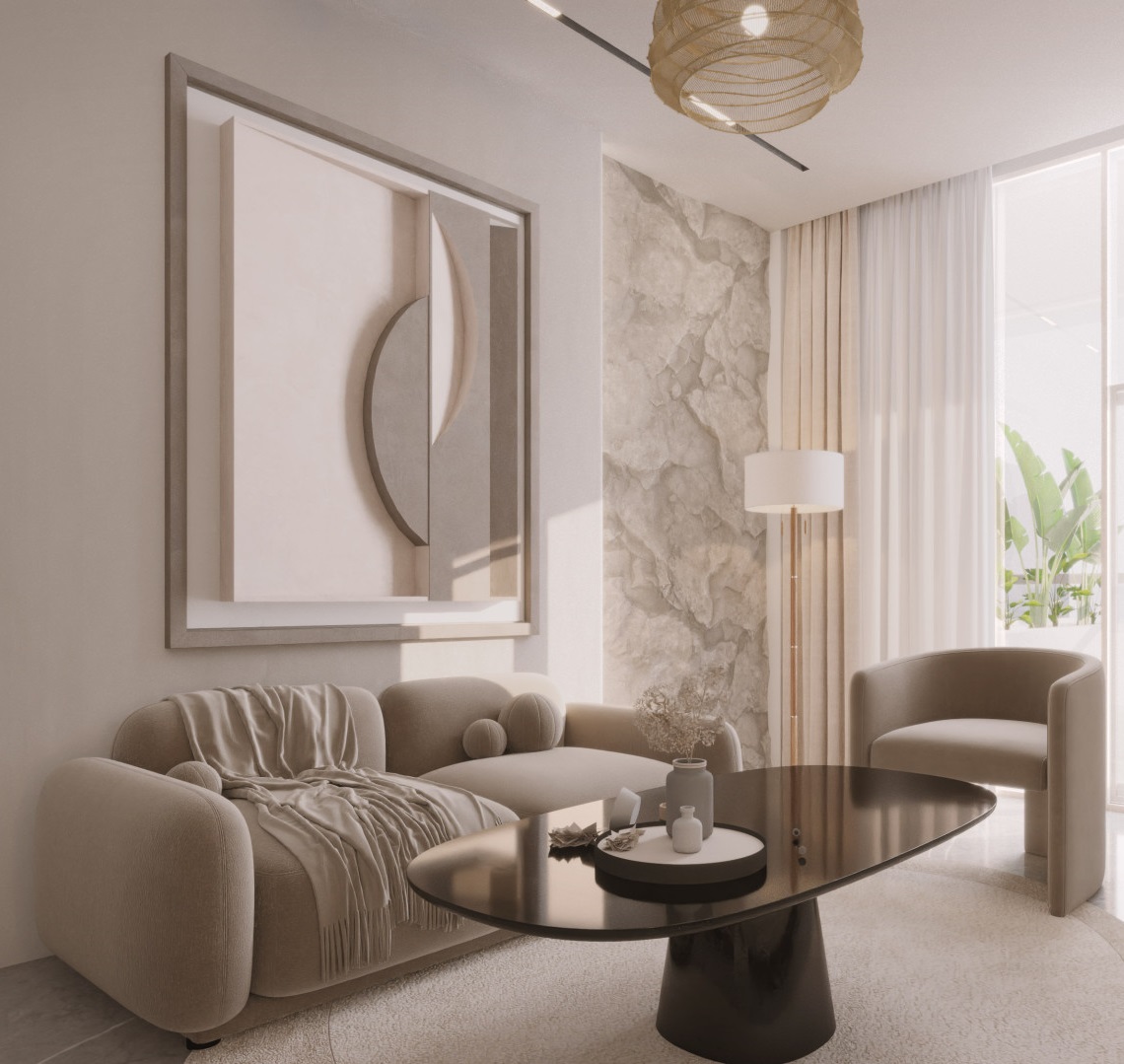 The development offers a range of studios, one-, and two-bedroom apartments, each including a private swimming pool. Interiors showcase premium finishes and carefully selected materials, emphasizing quality and elegance throughout the residences.