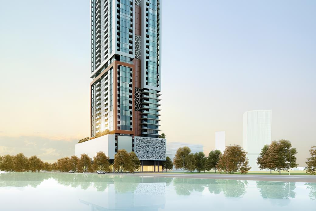 Faradis Tower by Tiger Group stands prominently on the Gulf Coast of the Al Mamzar Peninsula in Sharjah. The tower features a distinctive wavy design across its ground level, five podium floors, and 50 residential levels, creating a sophisticated architectural presence that harmonizes with its coastal surroundings.
