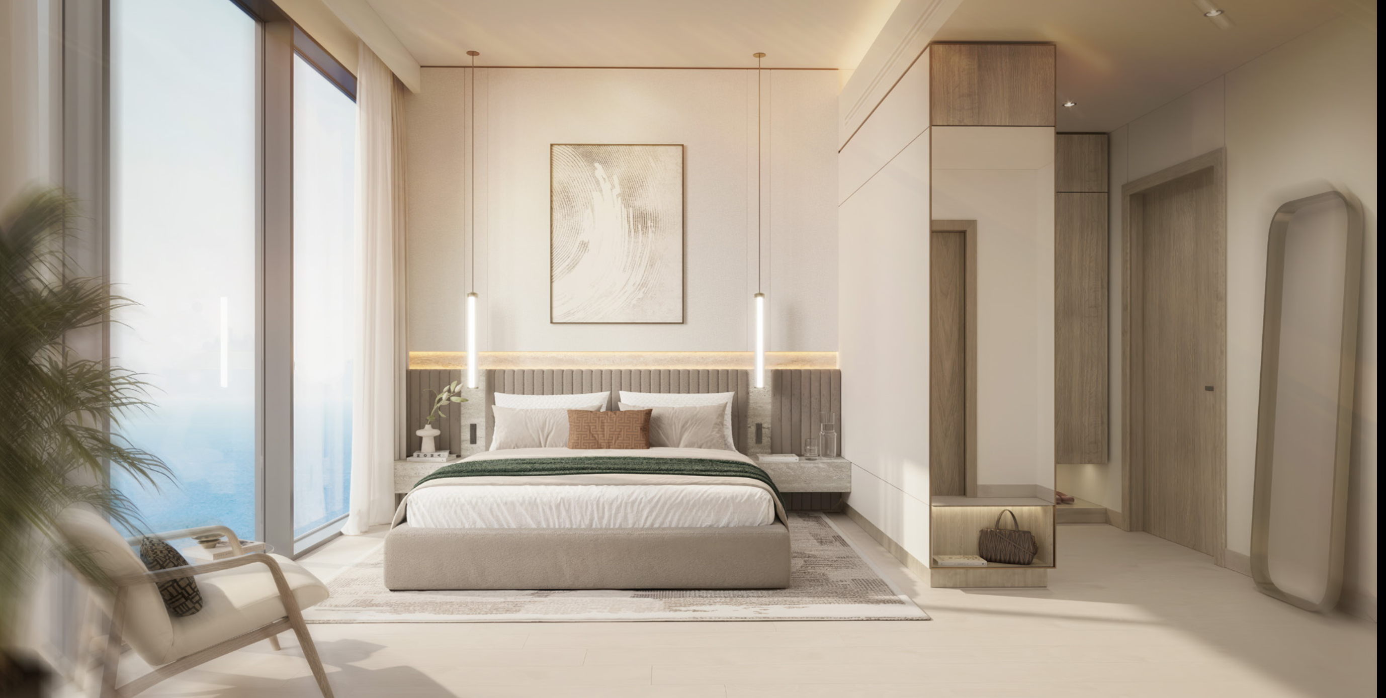 The residences include one- to three-bedroom apartments alongside spacious four-bedroom penthouses. Interiors are characterized by minimalist design and a natural color palette, focusing on comfort and visual harmony. Panoramic windows frame views of surrounding greenery and water, while smart layouts enhance privacy and spatial efficiency.