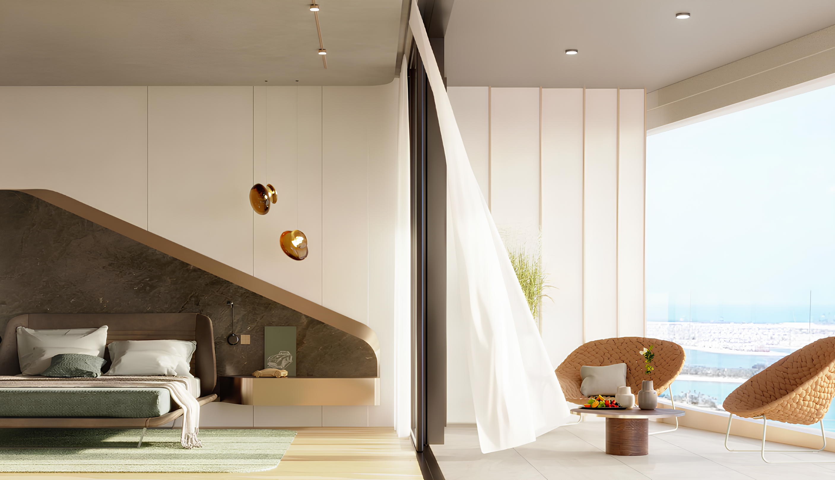 The project offers premium 1- to 3-bedroom apartments featuring high-quality natural materials and interiors finished in soft pastel tones. Each residence includes a private balcony that provides expansive views of the sea and cityscape, enhancing the living experience with natural light and outdoor space.
