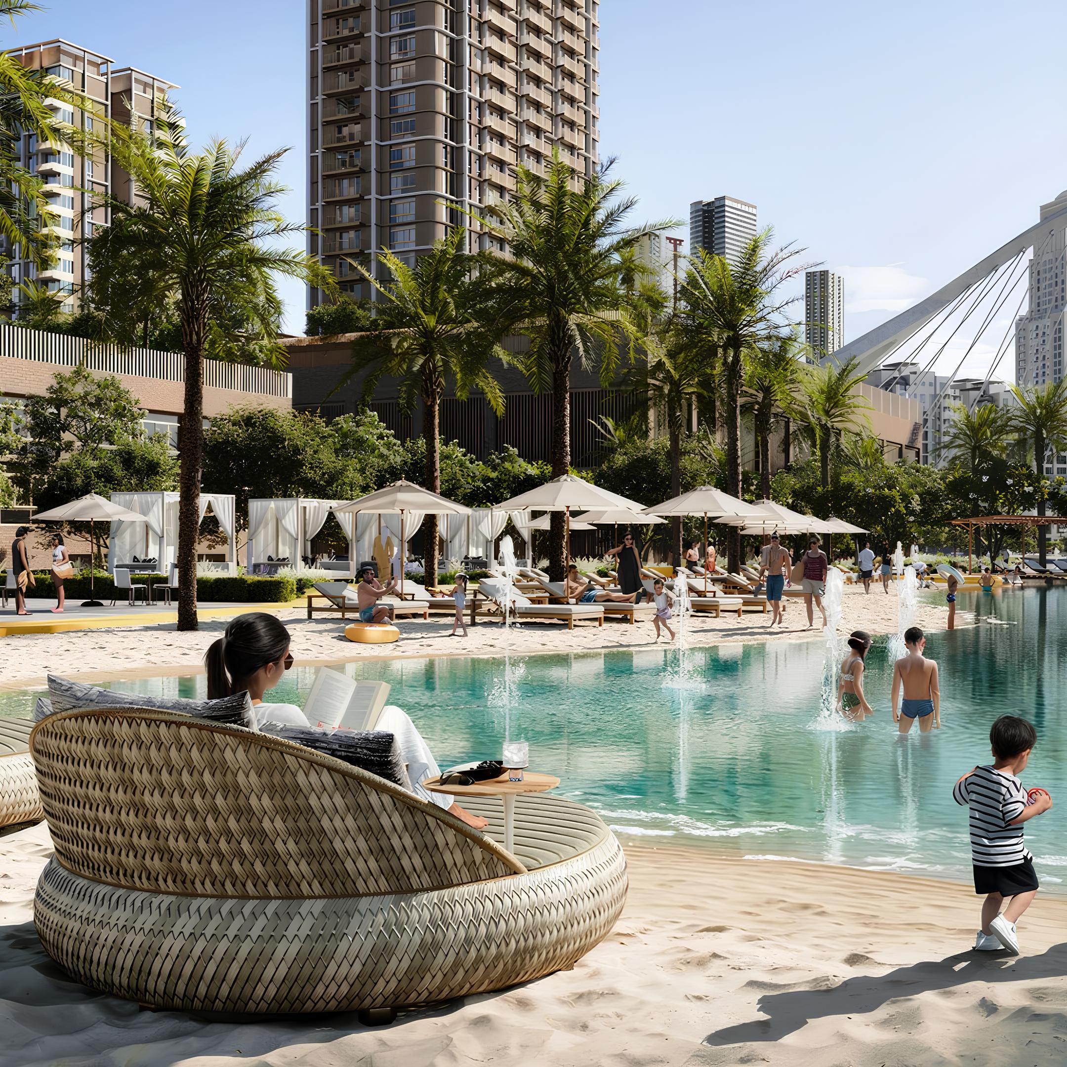 Residents benefit from a variety of amenities such as a kids play area, leisure zones, and a shared pool. The community is enhanced by access to Central Park, artificial lagoons, canal promenades, yacht marinas, an infinity pool, an open-air cinema, and a fitness center. The location provides convenient proximity to Downtown Dubai, Ras Al Khor Wildlife Sanctuary, and a selection of shops, restaurants, and pedestrian pathways overlooking the cityscape.