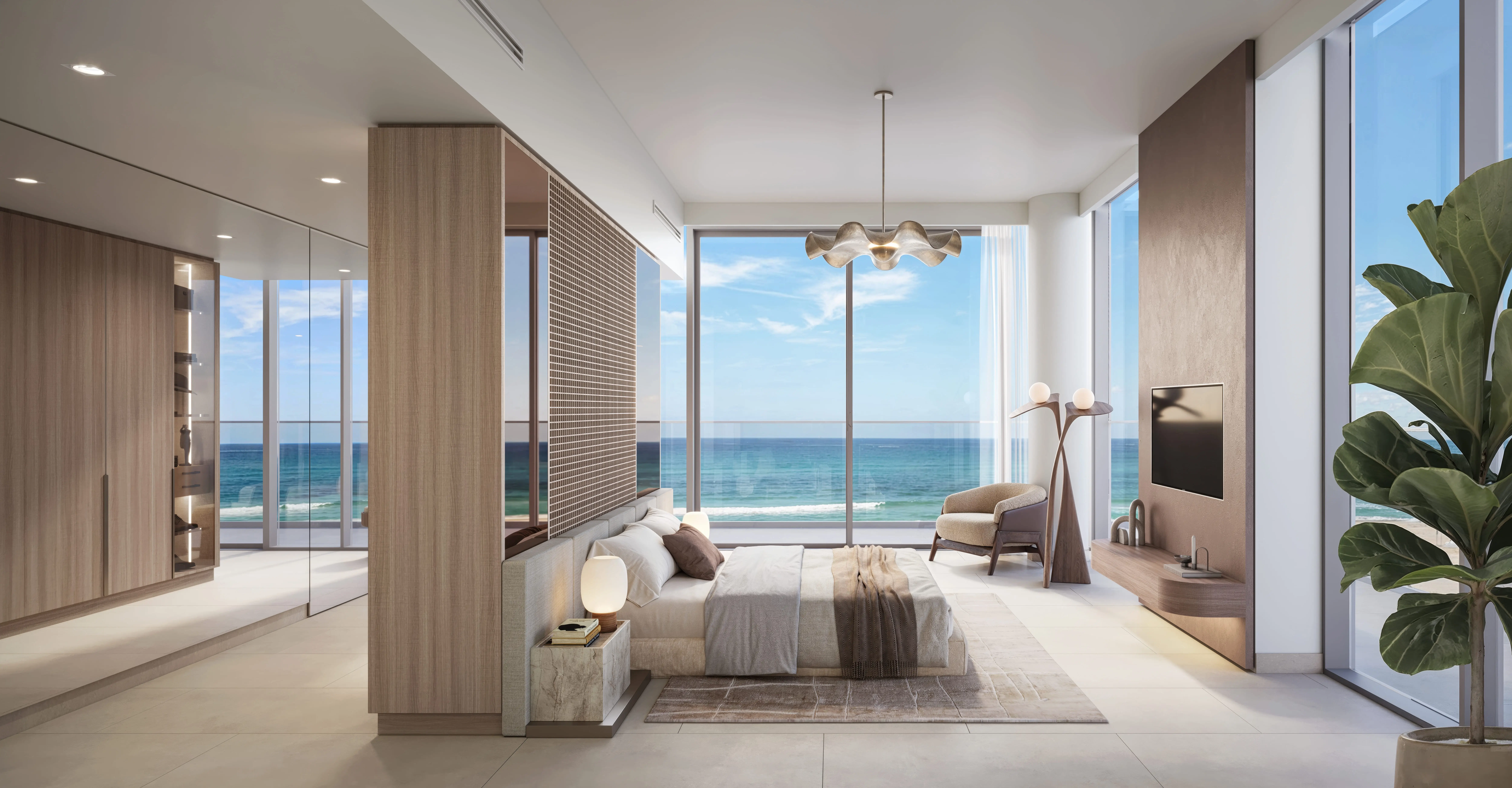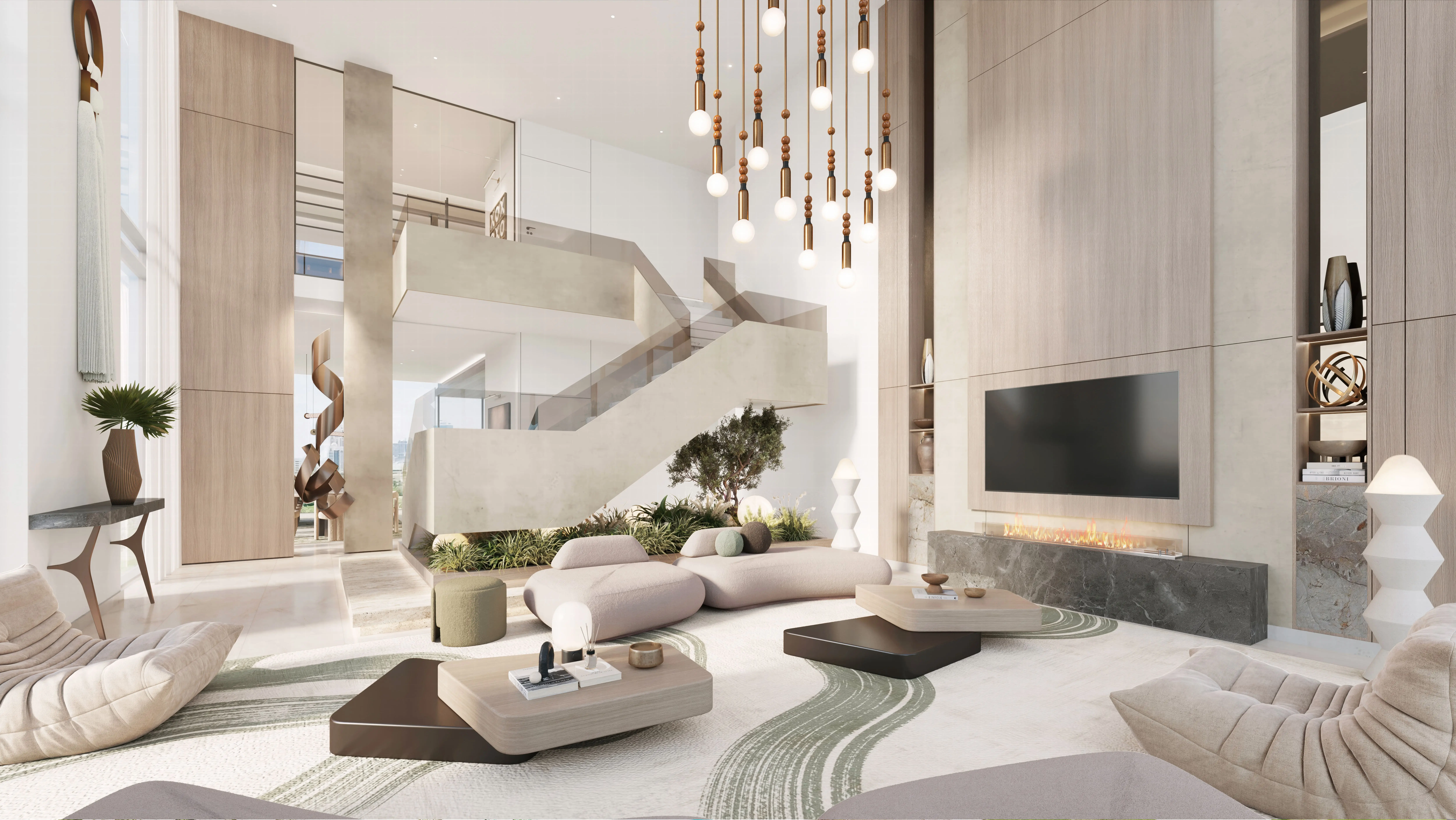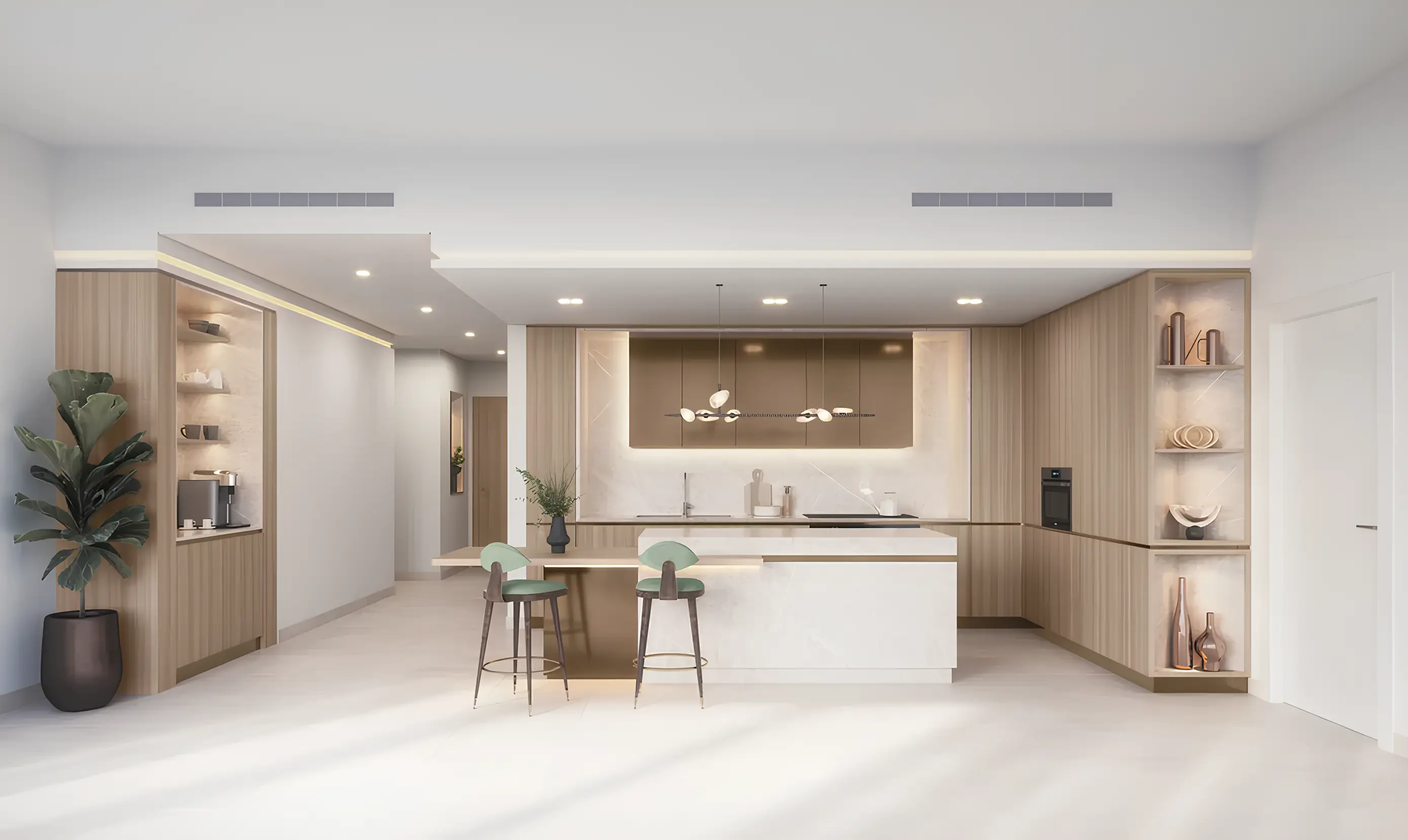 The residences include studios, one-, three-bedroom apartments, and spacious four-bedroom penthouses. Interiors are crafted with soft textiles and furniture to foster a relaxing ambiance. Kitchens are thoughtfully designed with smooth countertops, bronze accents, and practical storage, while bathrooms combine functionality with warm, organic finishes.