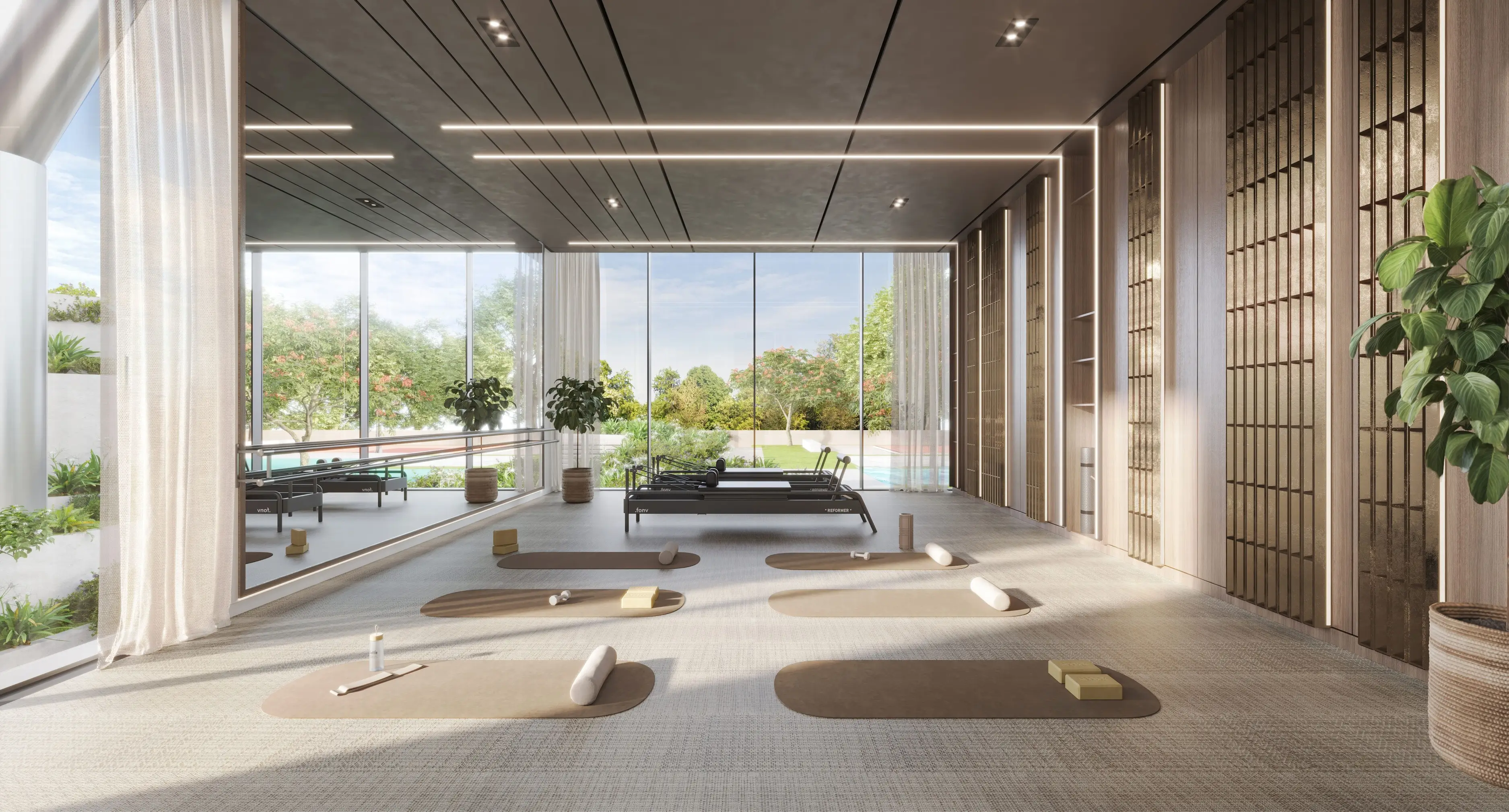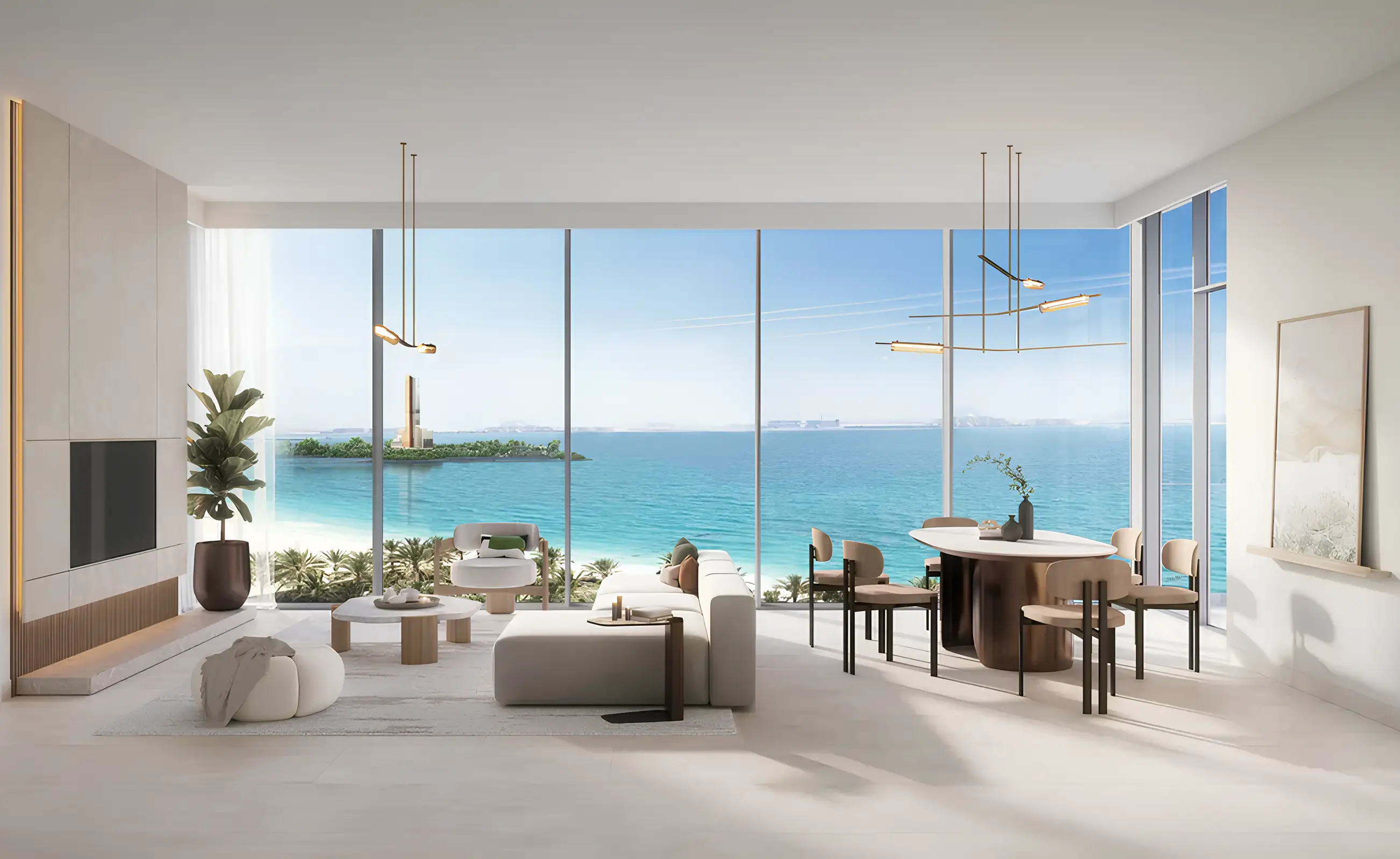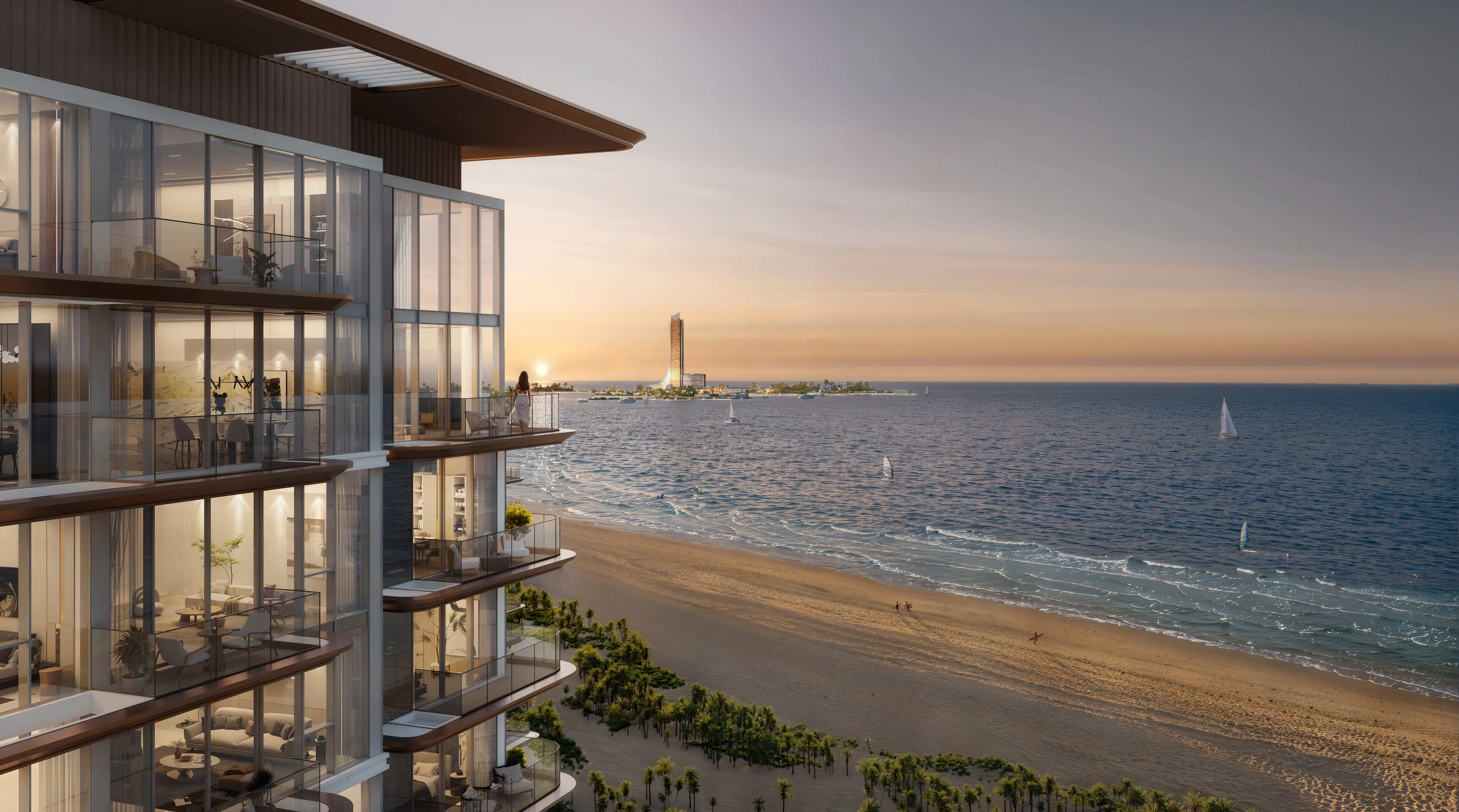 The residences include studios, one-, three-bedroom apartments, and spacious four-bedroom penthouses. Interiors are crafted with soft textiles and furniture to foster a relaxing ambiance. Kitchens are thoughtfully designed with smooth countertops, bronze accents, and practical storage, while bathrooms combine functionality with warm, organic finishes.